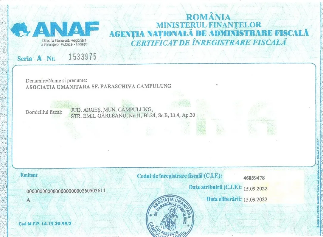 Asociatia Umanitara Sfanta Paraschiva Campulung isi desfasoara activitatea de colectare de fonduri de la persoane fizice si juridice pentru copii cu dizabilitati si familii defavorizate, fără venituri. Asociatia este compusa din trei mebri: presedinte, vicepresedinte si secretar; infiintata in data 15.09.2022, avand codul de inregistrare fiscala (C.I.F.) 46839478, Seria A, Nr. 1533975.